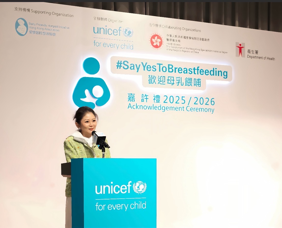 香港,2026 年 3月 27日 —— 母乳被公認為每個兒童人生的最佳起點,提供無可比擬的營養與健康益處。然而,許多媽媽在餵哺母乳的路上依然面對種種障礙,近年母乳餵哺率亦呈下降趨勢。聯合國兒童基金香港委員會(UNICEF HK)推動的「Say Yes To Breastfeeding」運動,積極倡導母乳餵哺的重要性,致力凝聚社區力量,營造支持母乳餵哺的文化,讓每一位母親都能夠實踐母乳餵哺。於 3 月 25 日舉行的「Say Yes To Breastfeeding」嘉許禮 2025/2026,正正表彰加入成為「母乳餵哺友善」行列,逾3,000 個工作間及場所。