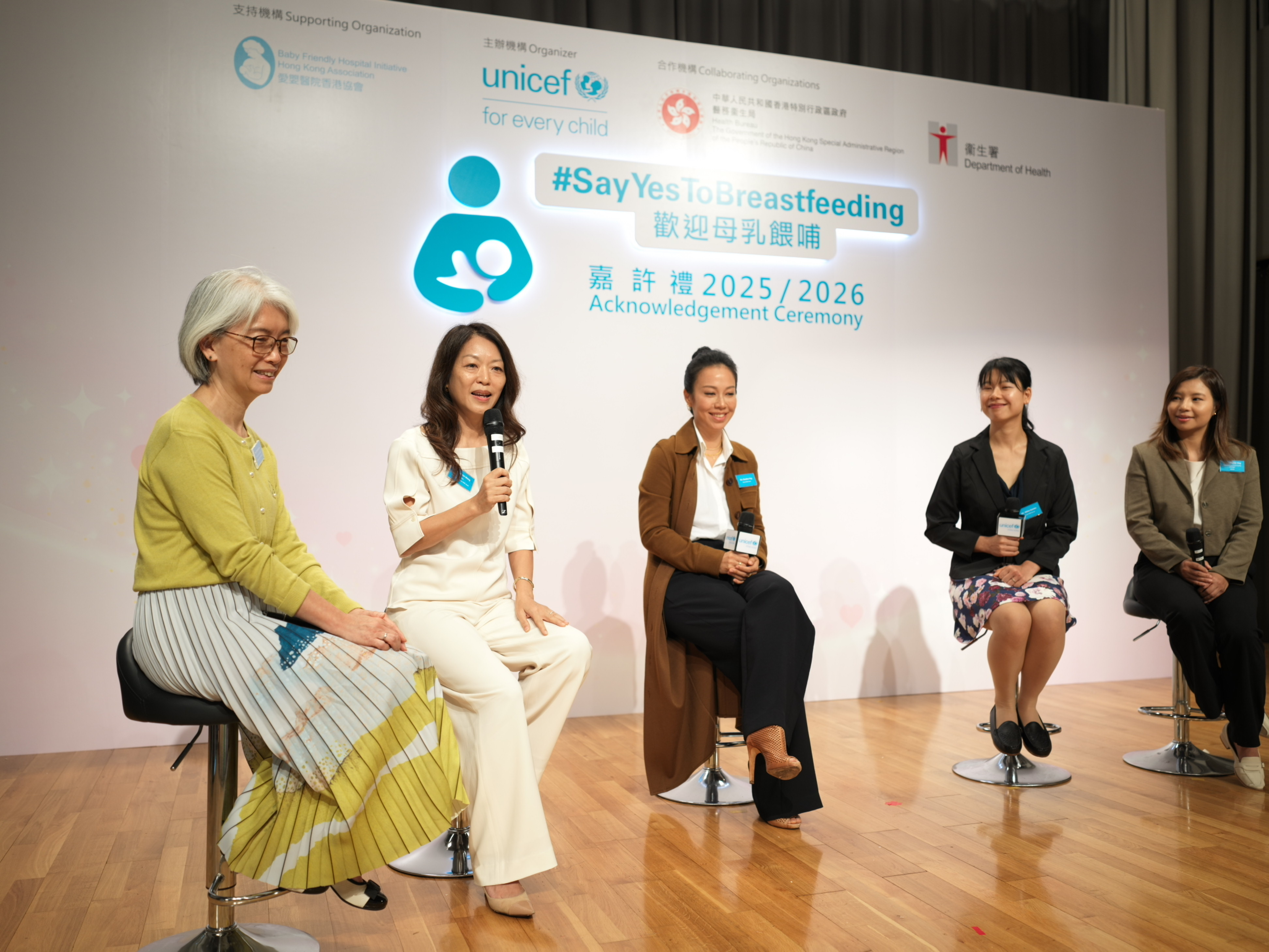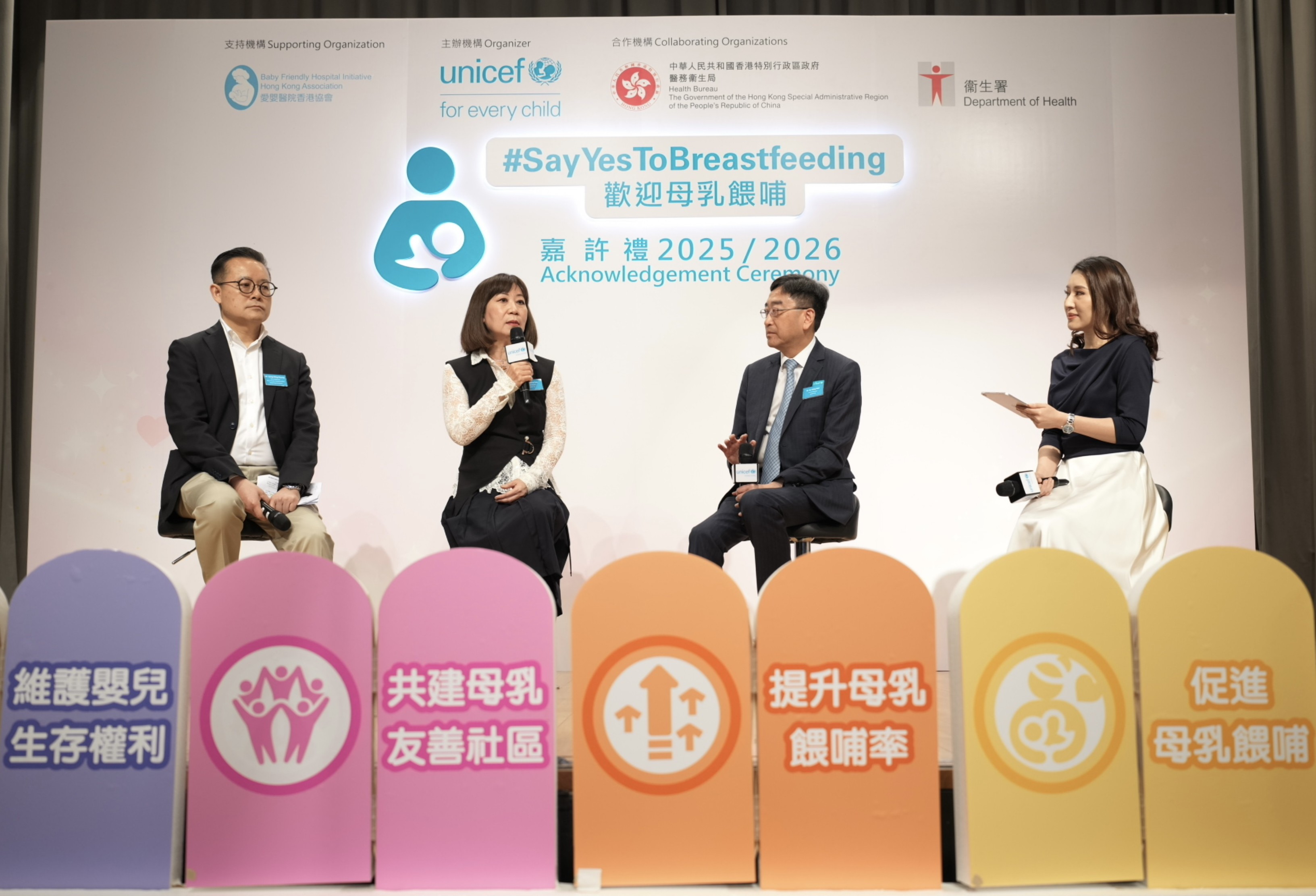 UNICEF HK 致力於本港推動母乳餵哺,為授乳媽媽創造友善的母乳餵哺環境。自 2015 年,UNICEF HK聯同醫務衞生局和衞生署推出「Say Yes To Breastfeeding」運 動,至今已成功接觸了超過 7,000 個企業會員及 63,000 多名專業界別人士的會員網絡,並獲逾 3,000 個工作間及場所加入成為「母乳餵哺友善」工作間及場所。典禮上頒發嘉許獎項及感謝狀表揚支持的企業及機構。