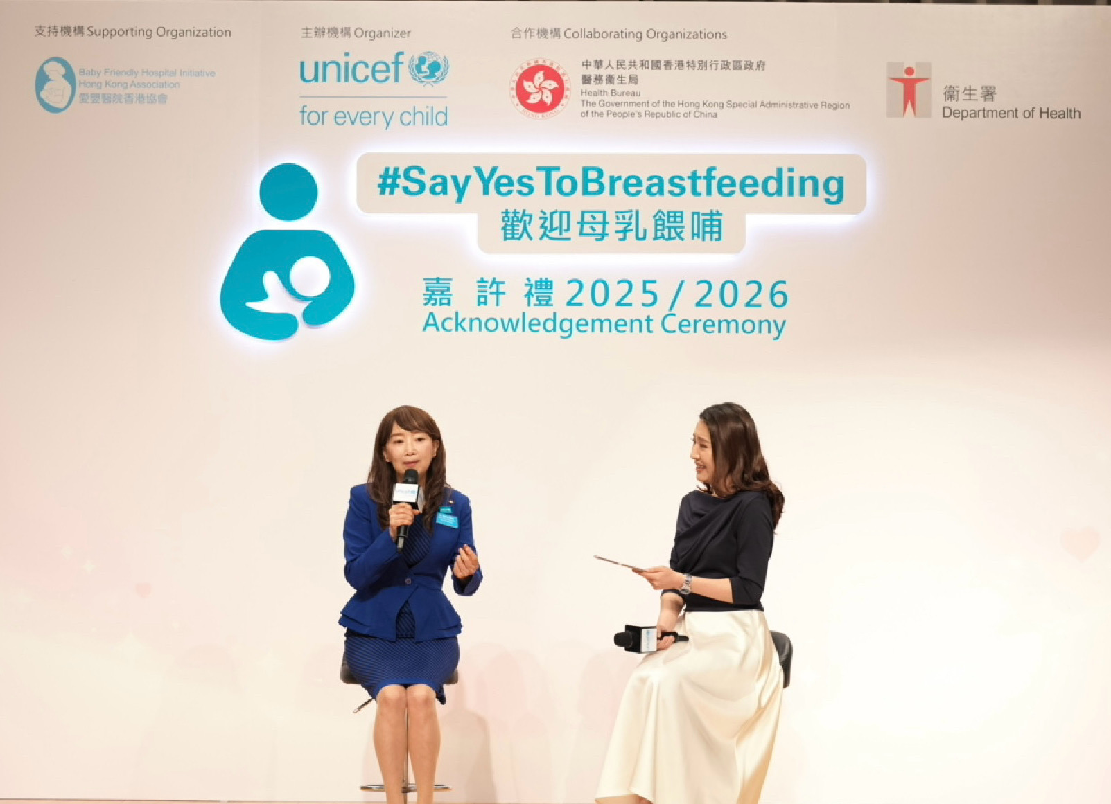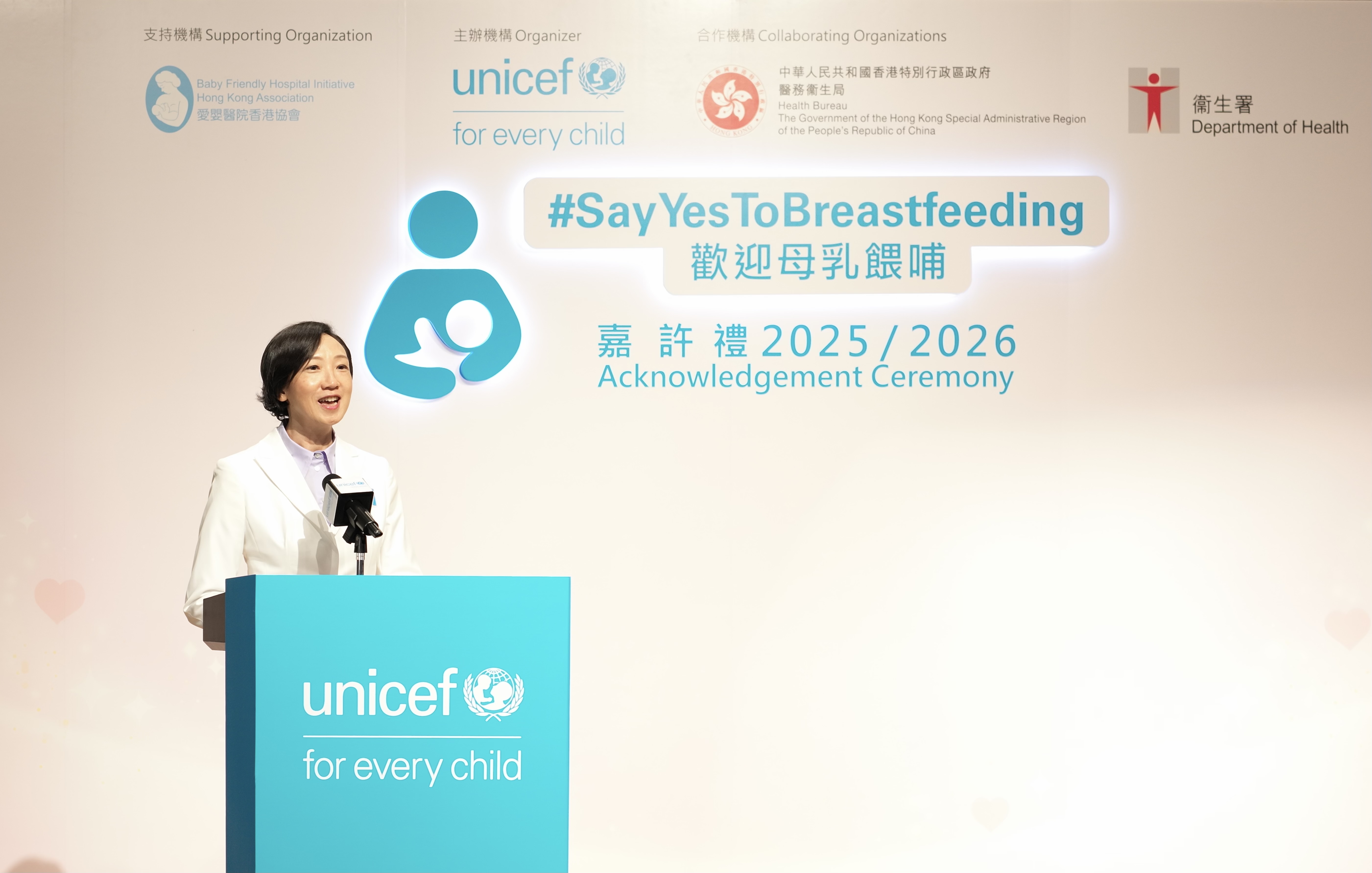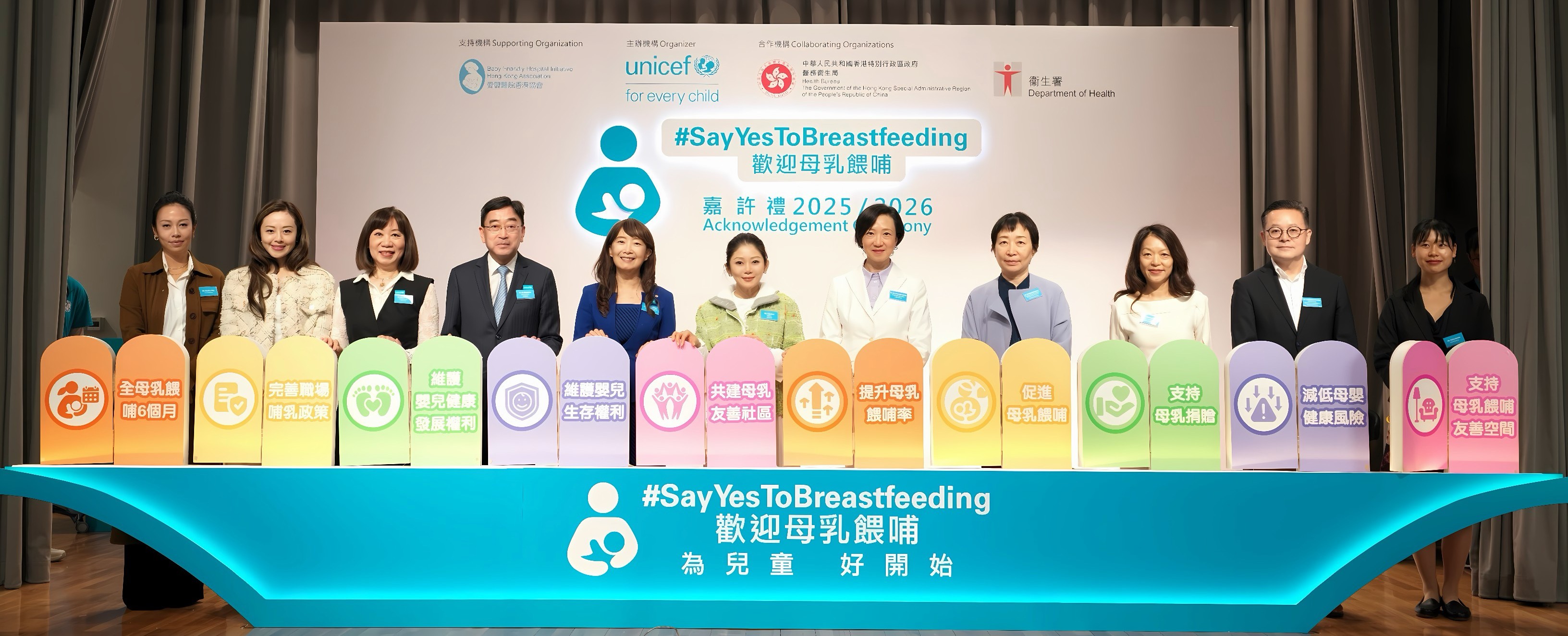 UNICEF HK 致力於本港推動母乳餵哺,為授乳媽媽創造友善的母乳餵哺環境。自 2015 年,UNICEF HK聯同醫務衞生局和衞生署推出「Say Yes To Breastfeeding」運 動,至今已成功接觸了超過 7,000 個企業會員及 63,000 多名專業界別人士的會員網絡,並獲逾 3,000 個工作間及場所加入成為「母乳餵哺友善」工作間及場所。典禮上頒發嘉許獎項及感謝狀表揚支持的企業及機構。