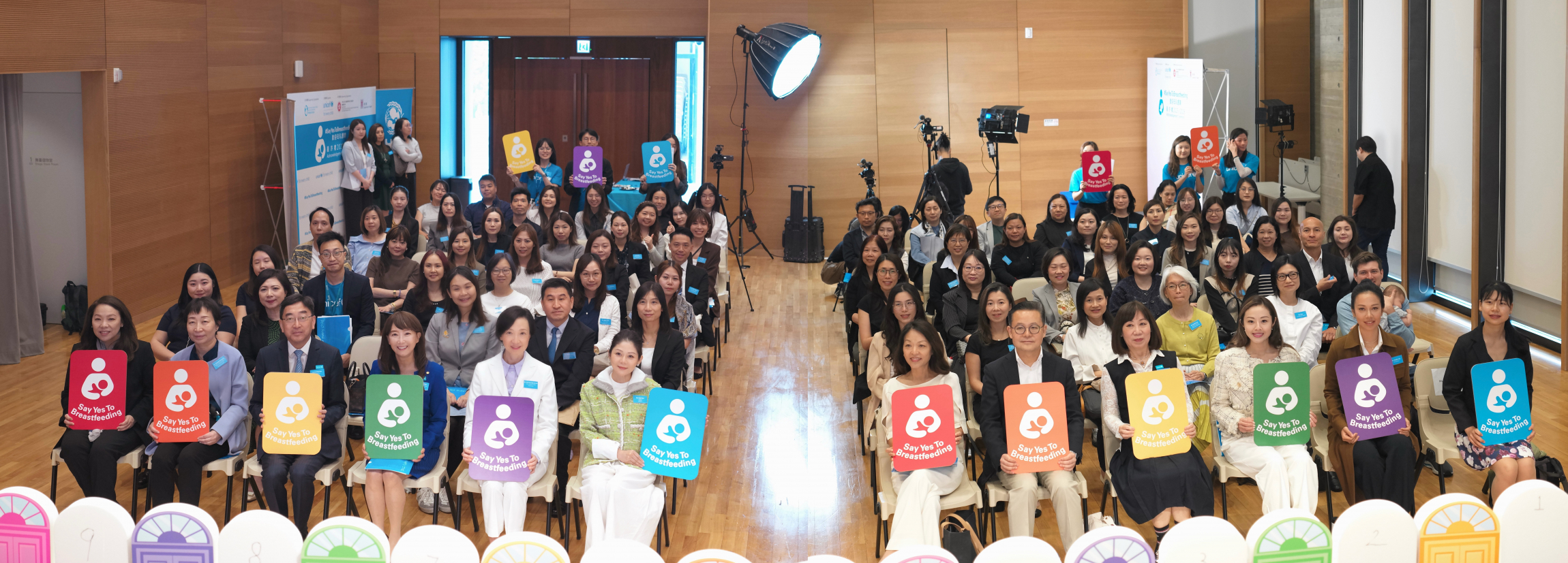 活動主禮嘉賓醫務衞生局副局長范婉雯醫生,連同UNICEF HK主席陳晴女士、衞生署社會醫學顧問醫生(家庭及學生健康)張竹君醫生、香港母乳庫總監黃明沁醫生、愛嬰醫院香港協會副主席梁永昌醫生、UNICEF HK委員高永文醫生及藍章翔醫生、UNICEF HK倡議委員會委員莊菲娜女士、UNICEF 地區(東亞及太平洋)大使陳美齡博士、母乳捐贈者邢嘉倩女士及Nikles Kotoko女士,與一眾企業和機構代表出席支持,彰顯各界合作推動持續餵哺母乳的決心。